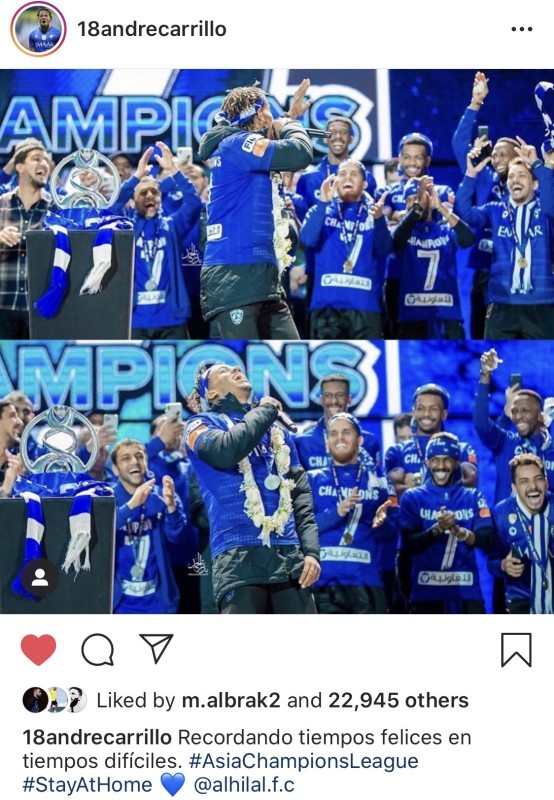 «أتذكر الآن الأوقات السعيدة في الأوقات الصعبة»، إشارة إلى صعوبة هذه الأيام بسبب فايروس كورونا، لكنه يحاول نسيان هذه الأيام الصعبة التي يمر بها العالم بالأوقات التي جلبت له السعادة ليضع صورته أثناء احتفال الهلال بتحقيق هذه البطولة، وكان كاريلو النجم الأول في مباراتي نهائي آسيا، إذ سجل هدف الهلال الوحيد في مباراة الذهاب لنهائي آسيا 2019 التي أقيمت في الرياض أمام أوراوا الياباني وصنع هدفي فريقه في مباراة الأياب التي انتهت هلالية 2 - صفر.