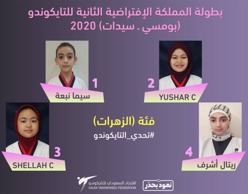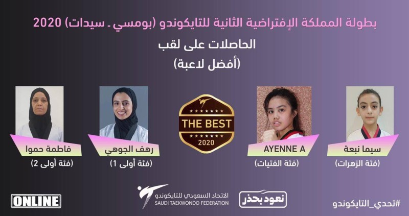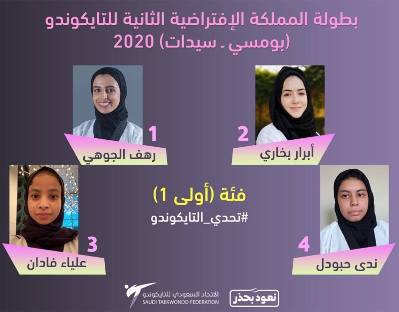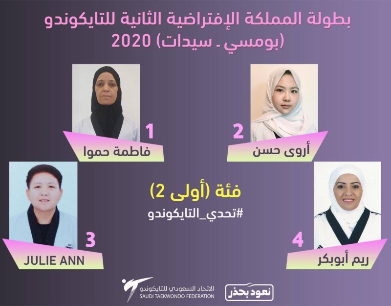 اختتم الاتحاد السعودي للتايكوندو منافسات بطولة المملكة الافتراضية الثانية للتايكوندو (بومسي ـ سيدات) التي أقيمت «عن بُعد» خلال الفترة من 24 - 27 يونيو بمشاركة 46 لاعبة من مختلف الفئات السنيّة، والتي تُقام لأول مرة على مستوى الإناث.