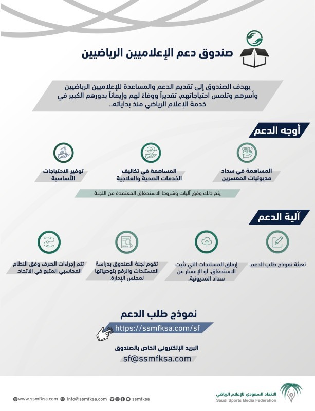 وتبدأ أولى خطوات طلب الدعم بتعبئة «نموذج طلب الدعم» يوضح فيه مسببات الطلب مع إرفاق المستندات التي تثبت الإعسار عن سداد المديونية، وذكر مبلغ المديونية الذي لم يتم سداده للبدء في دراسة الطلب من قبل اللجنة المختصة، التي بدورها تقوم برفع التوصيات والمقترحات إلى رئاسة اتحاد الإعلام الرياضي، ويتوفر النموذج عبر موقع الاتحاد: https://ssmfksa.com/sf، كما تم تخصيص البريد الإلكتروني sf@ssmfksa.com لاستقبال كافة الاستفسارات والاقتراحات الخاصة بخدمات الصندوق.