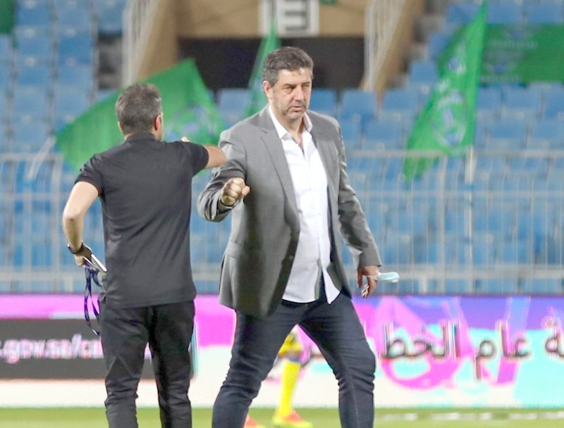 فيتوريا (مدرب النصر) يهنئ فيريرا (مدرب الفتح) بالفوز عقب المباراة. (تصوير: علي الغامدي)