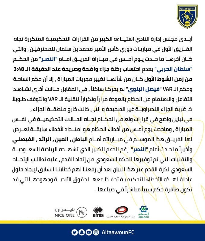 وتذمرت إدارة نادي التعاون عبر بيان نشرته في حساب النادي الرسمي بتويتر من القرارات التحكيمية المتكررة تجاه الفريق، على حد ذكرها، والتي كان آخرها ما حدث في مباراة النصر من الحكم سلطان الحربي بعدم احتساب ركلة جزاء عند الدقيقة الـ 3:48 من زمن الشوط الأول، مستغربة من موقف حكم الـ VAR، والذي لم يحرك ساكناً.