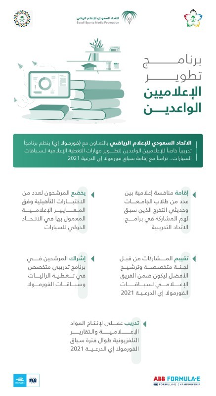 ضمن برنامج تطوير الإعلاميين الواعدين الذي يندرج تحت مبادرة تطوير الإعلام الرياضي، رشح الاتحاد السعودي للإعلام الرياضي عدداً من الإعلاميين الواعدين للمشاركة في التغطية الإعلامية لـ(سباق فورمولا إي الدرعية 2021)، حيث أتاحت (فورمولا إي) الفرصة لمجموعة من الإعلاميين الواعدين ليكونوا ضمن الفريق الإعلامي لسباقات الفورمولا إي، والمشاركة في إعداد التقارير التلفزيونية للسباق، والتواجد في كواليس حلبة السباق، والاستفادة من الخبرات الإعلامية العالمية المتواجدة لتغطية الحدث الكبير.