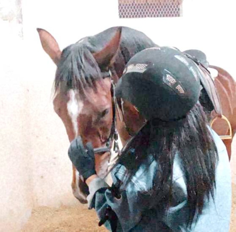 الفارسة الصغيرة دانة عيسى تداعب أحد الخيول في الاسطبل. (عكاظ)