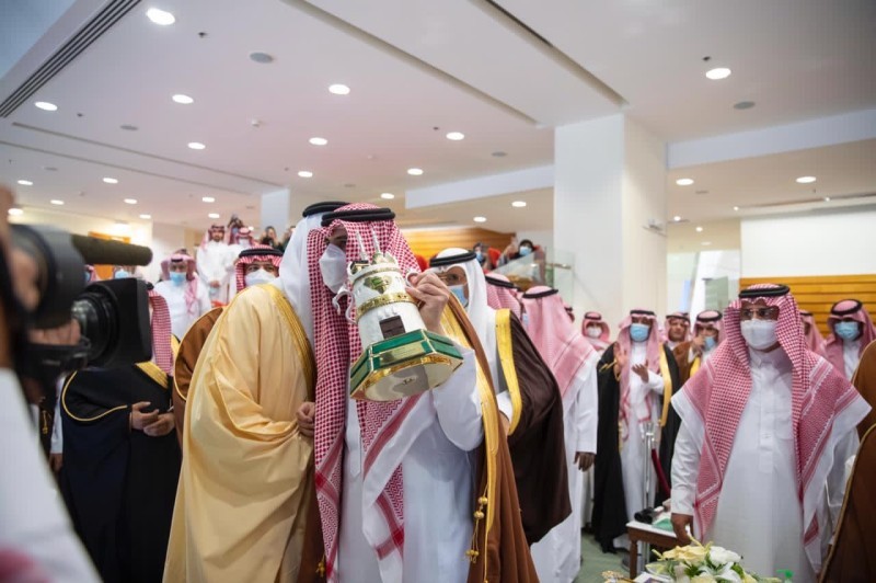 وسلم الأمير فيصل بن بندر الكأس للأمير سعود بن سلمان، مقدماً له التهنئة بهذا الإنجاز.