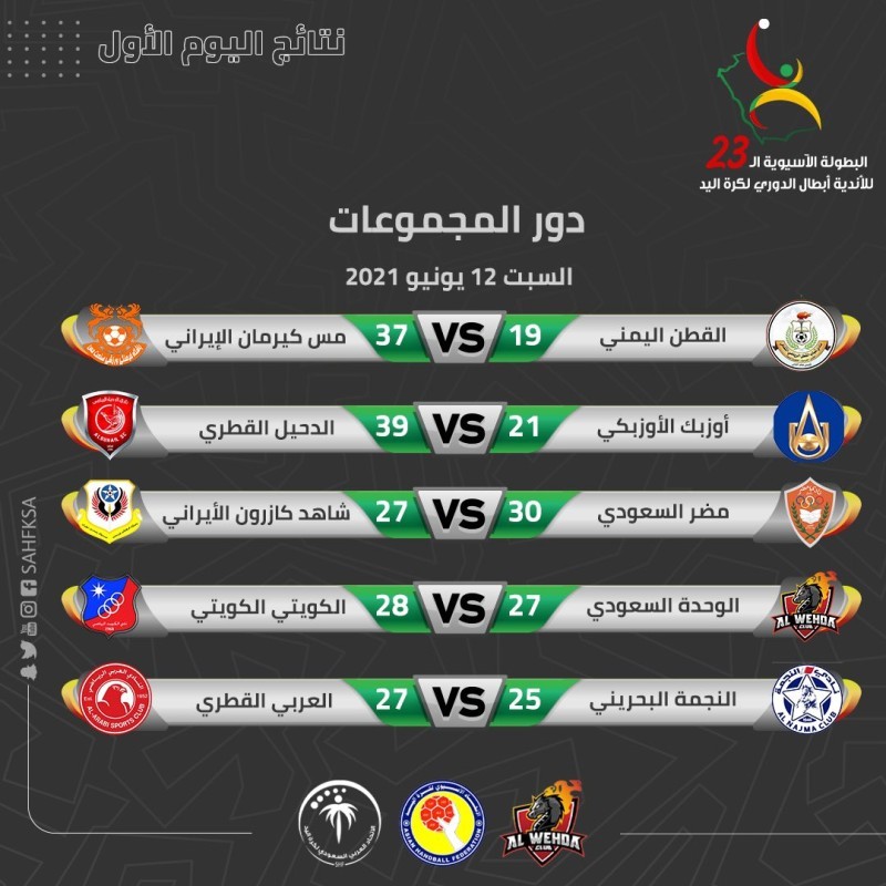وفي المجموعة الأولى حقق مضر السعودي فوزاً مستحقاً على شاهد كازرون الإيراني 27-30 وحصل على جائزة أفضل لاعب محمد عباس من مضر السعودي، فيما فاز العربي القطري على النجمة البحريني في آخر مواجهات اليوم الأول من البطولة بنتيجة 27-25.