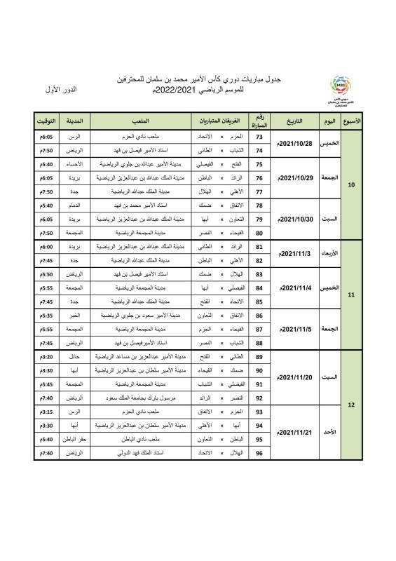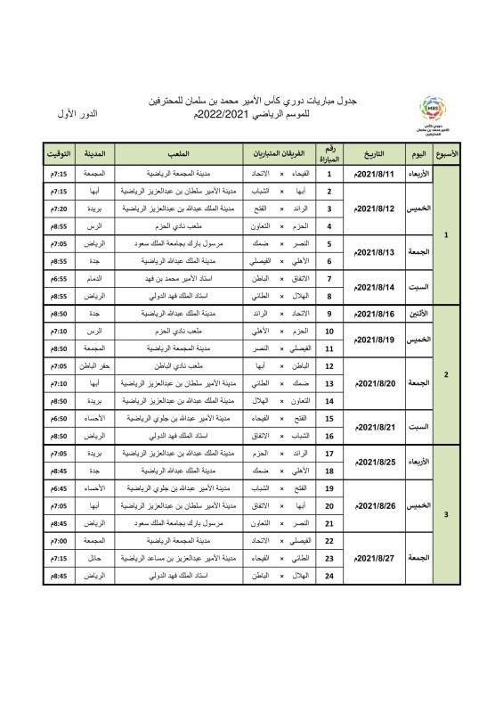 أصدرت لجنة المسابقات في رابطة الدوري السعودي للمحترفين جدول مباريات الدور الأول من مسابقة دوري كأس الأمير محمد بن سلمان للمحترفين، للموسم الرياضي 2022/2021، والذي سينطلق يوم الأربعاء الموافق 11 أغسطس 2021.