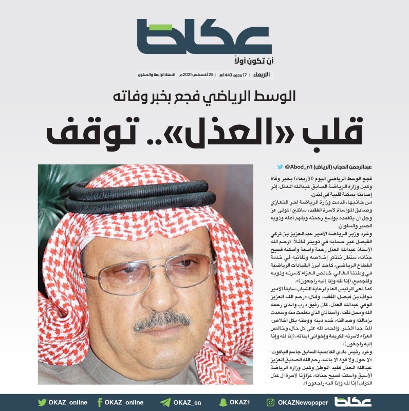فجع الوسط الرياضي اليوم بخبر وفاة وكيل وزارة الرياضة السابق عبدالله العذل، إثر إصابته بسكتة قلبية في لندن. من جانبها، قدمت وزارة الرياضة أحر التعازي وصادق المواساة لأسرة الفقيد، سائلين المولى عز وجل أن يتغمده بواسع رحمته ويلهم أهله وذويه الصبر والسلوان. وغرد وزير الرياضة الأمير عبدالعزيز بن تركي الفيصل عبر حسابه في تويتر قائلاً: «رحم الله الأستاذ عبدالله العذل رحمة واسعة وأسكنه فسيح جناته، سنظل نتذكر إخلاصه وتفانيه في خدمة القطاع الرياضي، كأحد أبرز القيادات الرياضية في وطننا الغالي، خالص العزاء لأسرته وذويه وللجميع، (إنا لله وإنا إليه راجعون)». كما نعى الرئيس العام لرعاية الشباب سابقاً الأمير نواف بن فيصل، الفقيد، وقال: «رحم الله العزيز الوفي عبدالله العذل، كان رفيق درب والدي رحمه الله ومحل ثقته، وأستاذي الذي تعلمت منه وسعدت بزمالته وصداقته، خدم دينه ووطنه بكل اخلاص، آلمنا جدا الخبر، والحمد لله على كل حال، وخالص العزاء لأسرته الكريمة وإخواني أبنائه، (إنّا لله وإنّا إليهِ رَاجعُون)». وغرد رئيس نادي القادسية السابق جاسم الياقوت: «لا حول ولا قوة الا بالله، رحم الله الصديق العزيز عبدالله العذل فقيد الوطن وكيل وزارة الرياضة الأسبق وأسكنه فسيح جناته، عزاؤنا لأسرة آل عذل الكرام، (إنا لله وإنا اليه راجعون)».