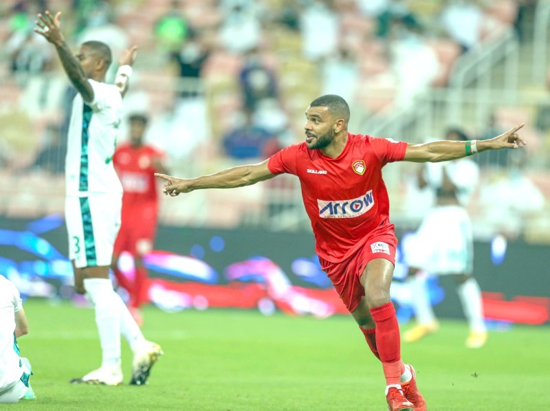 الجزائري هلال سوداني محتفلاً بهدفه في مرمى الأهلي عند الدقيقة 19. (تصوير: عبدالغني بشير)
