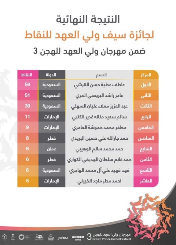 أعلنت اللجنة المنظمة لمهرجان ولي العهد في نسخته الثالثة أمس (الاثنين)، استحقاق سيف ولي العهد للنقاط لمالك الهجن عاطف بن عطية القرشي، بعد مضي 30 يوماً من ختام المهرجان نظراً لفوزه المستحق بعد ما كان سيذهب لفائزٍ آخر.