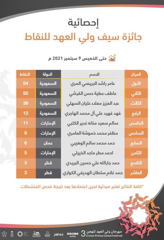 وكانت اللجنة المنظمة في آخر إحصائية اعلنت في 9 سبتمبر الماضي أن المتقدم في المركز الأول هو عامر بن راشد المرّي بـ54 نقطة وثانياً عاطف عطية القرشي بـ50 نقطة، لتعلن أمس تغيّر النتائج النهائية بفوز القرشي بالسيف لحصوله على 56