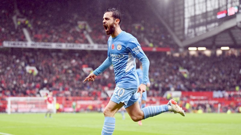برناردو سيلفا محتفلا بالهدف الثاني في مرمى اليونايتد أمس بملعب أولد ترافورد. (Getty)