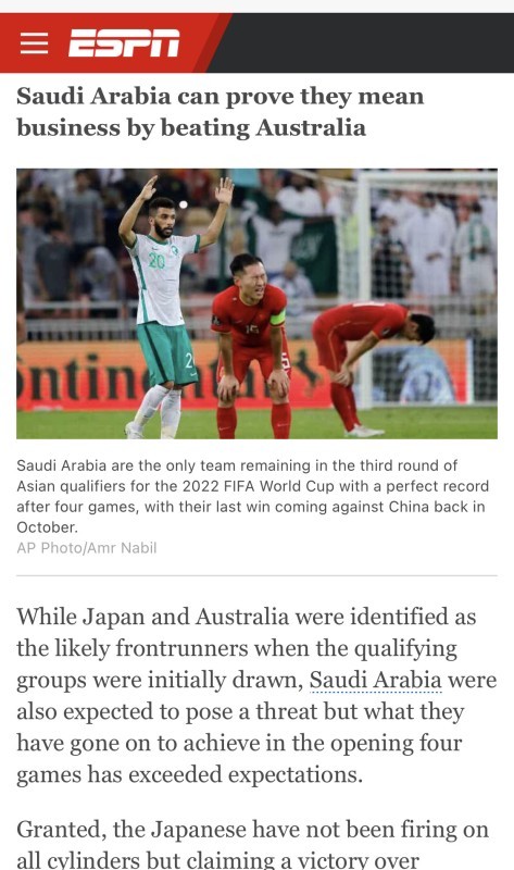 ونوهت ESPN عبر تقريرها بتميز المنتخب السعودي كونه الفريق الوحيد في الدور الثالث من التصفيات الآسيوية المؤهلة لكأس العالم 2022 برقم قياسي مثالي بعد أربع مباريات، عقب فوزه الأخير ضد الصين في أكتوبر.