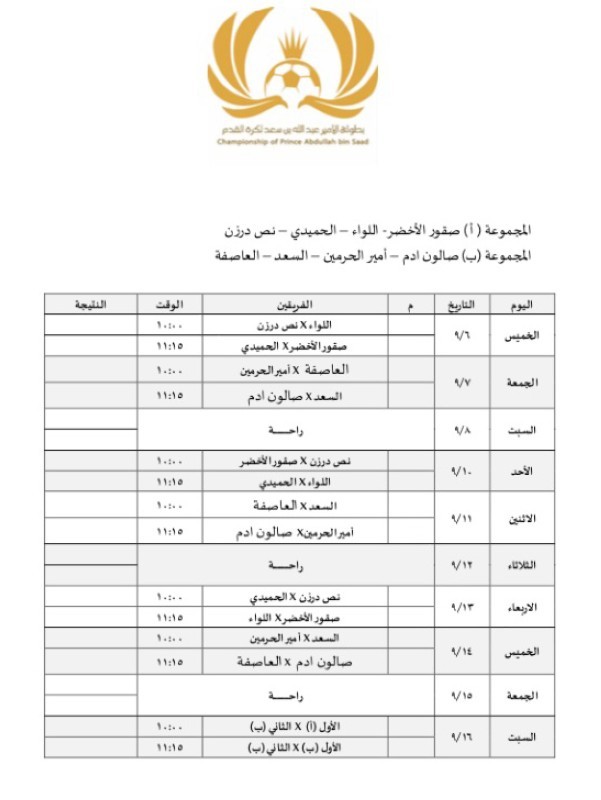 وتبدأ البطولة بلقاء افتتاحي يجمع فريقي اللواء ونص درزن في تمام الساعة «10.00مساء»، وتليه المباراة الثانية بين فريقي صقور الأخضر مع الحميدي الساعة «11.15مساء»، وكان قد تم توزيع الفرق إلى مجموعتين، إذ تضم الأولى فرق «صقور الأخضر واللواء والحميدي ونص درزن»، والمجموعة الثانية تضم فرق «أمير الحرمين والسعد والعاصفة وصالون آدم». من جهته، أوضح رئيس اللجنة التنفيذية للبطولة عبدالرزاق البلوشي، أن بطولة العام الحالي في نسختها الرابعة تحظى برعاية ودعم واهتمام ومتابعة الأمير عبدالله بن سعد بن عبدالعزيز، بصفته رئيساً للجنة العليا المنظمة للبطولة، إذ ستشهد مُفاجآت كبيرة وفعاليات ضخمة، وستحصل الفرق الفائزة بالمراكز الأولى على جوائز مالية قيمة، إضافة لجوائز أفضل لاعب وهداف البطولة وأحسن حارس وكأس البطولة والميداليات لأصحاب المراكز الأولى.