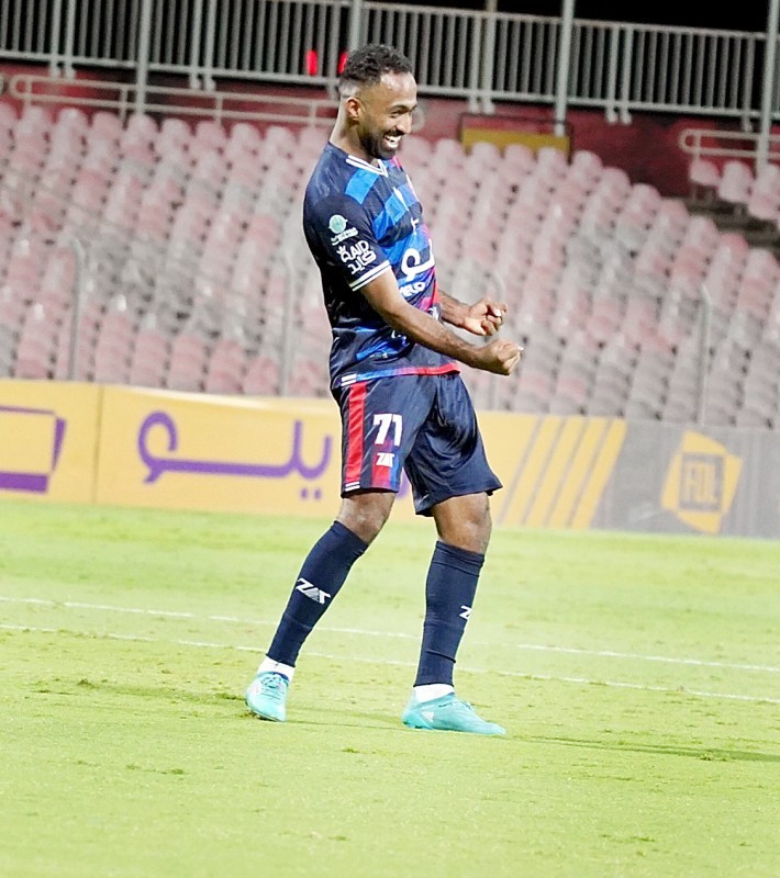 مهاجم الوحدة أحمد عبده يحتفل برباعيته في شباك العروبة.