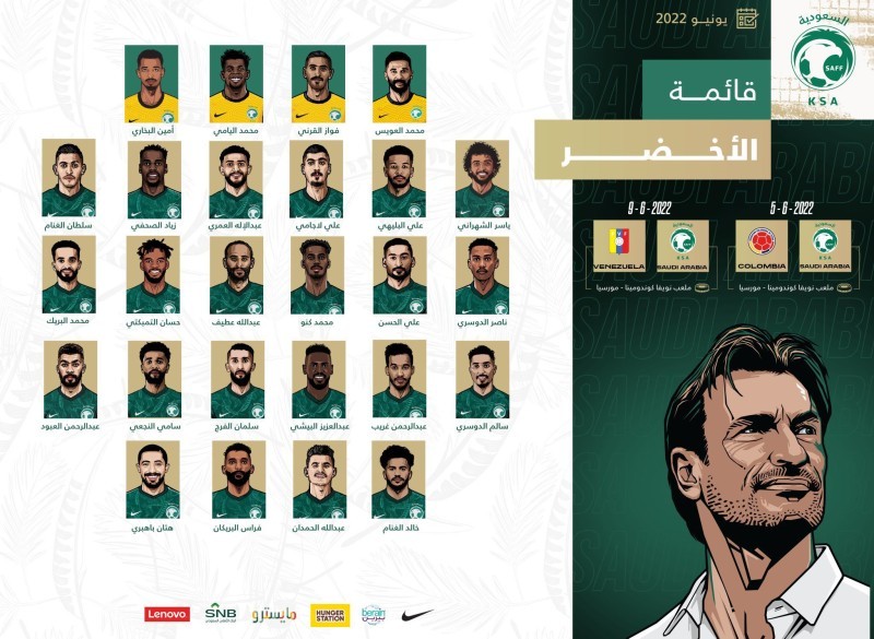 أعلن المدير الفني للمنتخب السعودي لكرة القدم «إيرفي رينارد» قائمة المنتخب المشاركة في المعسكر الإعدادي الذي سيقام في مدينة اليكانتي الإسبانية خلال الفترة من 31 مايو وحتى 9 يونيو، وذلك ضمن المرحلة الأولى من البرنامج الإعدادي لكأس العالم FIFA قطر 2022 التي تنطلق في شهر نوفمبر المقبل.