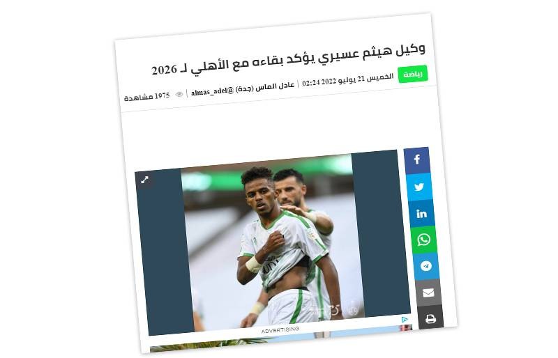 وكانت «عكاظ» تميزت بنشر خبر بقاء اللاعب هيثم عسيري في النادي حتى عام 2026 حسب ما أكده لـ«عكاظ» وكيل أعمال اللاعب بناءً على رغبة موكله بالتواجد في جدة، موضحاً أنه تم الاتفاق مع الإدارة الأهلاوية على تمديد عقد اللاعب لموسمين إضافيين؛ لينتهي في 2026.