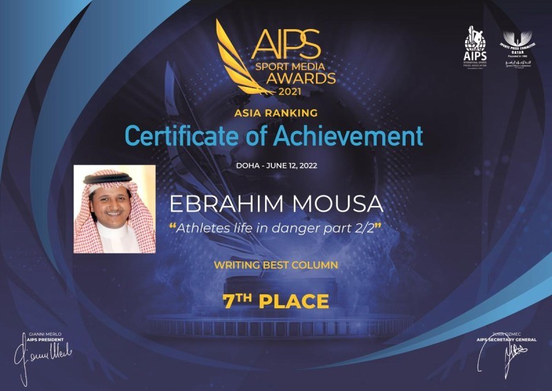 منح الاتحاد الدولي للصحافة الرياضية «AIPS»، الصحفي إبراهيم موسى، شهادة المركز السابع في قائمة أفضل عشرة صحفيين رياضيين على مستوى القارة الآسيوية في الدورة الرابعة من جوائز الاتحاد الدولي للصحافة الرياضية «AIPS» التي اختتمت أخيرا بمشاركة أكثر من 1700 عمل صحفي من 133 دولة حول العالم بـ34 لغة مختلفة والتي تعتبر أعلى الجوائز الدولية في صناعة الإعلام الرياضي، وذلك بعد أن تجاوز خلالها المرحلتين الأولى والثانية من التحكيم ببلوغه للقائمة القصيرة من الجائزة كأول صحفي من صحيفة سعودية وخليجية يصل لهذه المرحلة والمركز المتقدم على مستوى القارة الآسيوية في تاريخ الجائزة، نتيجة مشاركته بملف رياضي ضخم حمل عنوان: «حياة الرياضيين في خطر»، ناقش خلاله أهم المخاطر التي تُهدد حياة الرياضيين والرياضيات في العالم، بالأرقام والإحصاءات والبيانات والصور والتوصيات الهادفة المفيدة.