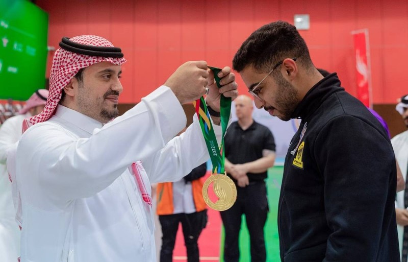 تّوج الأمير فهد بن جلوي بن عبد العزيز بن مساعد، نائب رئيس اللجنة الأولمبية والبارالمبية السعودية، مدير دورة الألعاب السعودية، الفائزين في منافسات الجمباز والملاكمة التايلاندية والتي اختتمت منافساتها ضمن دورة الألعاب السعودية 2022.