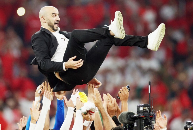 لاعبو المنتخب المغربي يحملون المدرب وليد الركراكي عقب التأهل لدور الـ 16 في المونديال.