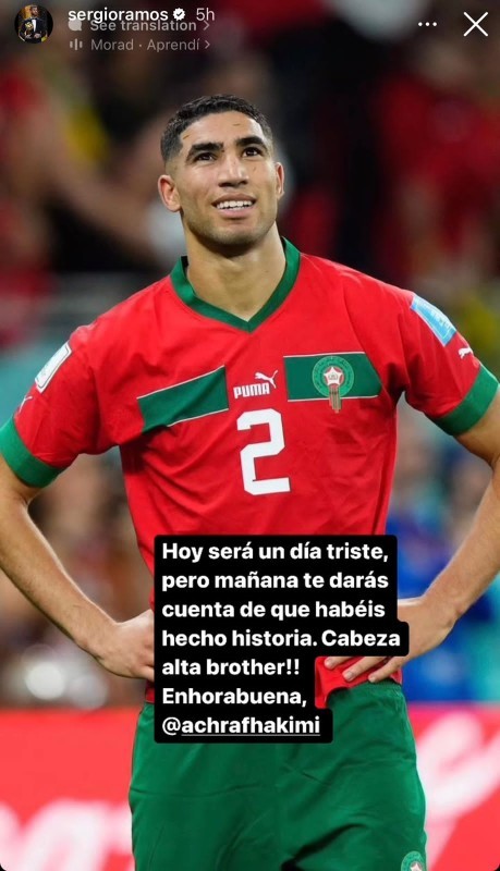 ونشر راموس صورة للمغربي أشرف حكيمي بقميص منتخب بلاده معلقاً عليها: سيكون اليوم يوماً حزيناً، لكنك ستدرك غداً أنك صنعت التاريخ أيها الأخ، تهانينا لك.