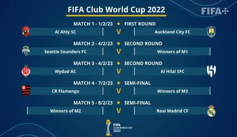 أسفرت قرعة كأس العالم للأندية 2022، التي أقيمت ظهر اليوم (الجمعة) في أكاديمية محمد الخامس لكرة القدم بمدينة الرباط في المغرب، عن مواجهة الهلال بطل آخر نسخة لدوري أبطال آسيا مع نظيره الوداد المغربي بطل أفريقيا، في مواجهة عربية من العيار الثقيل، وذلك في دور ربع النهائي من البطولة. ومن المقرر أن تنطلق بطولة كأس العالم للأندية 1 فبراير المقبل، بمواجهة الأهلي وأوكلاند في افتتاح المسابقة على أن يواجه الفائز من هذه المباراة فريق «سياتل الأمريكي» بطل كونكاكاف في ربع نهائي كأس العالم للأندية 2022. ويواجه الفائز من الهلال والوداد المغربي فريق فلامينغو البرازيلي في نصف نهائي بطولة كأس العالم للأندية، وستكون مباريات البطولة على النحو التالي: