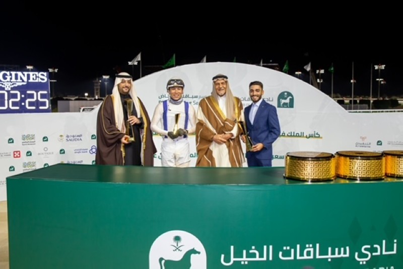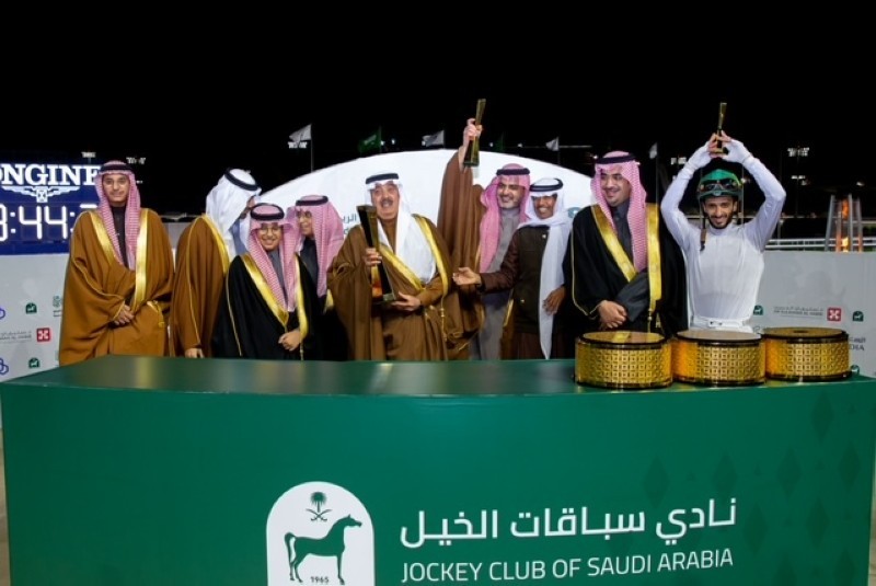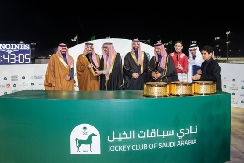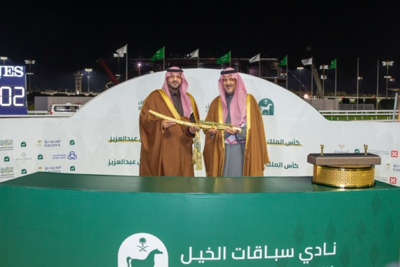 وسلم رئيس هيئة الفروسية رئيس مجلس إدارة نادي سباقات الخيل الأمير بندر بن خالد الفيصل، السيف والجائزة للفائزين.