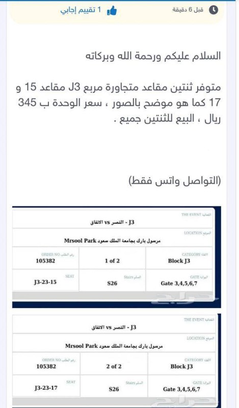 وعلى نفس الصعيد أعلن حساب مرسول بارك اليوم إعادة طرح التذاكر الموسمية لمباريات النصر وستكون متاحة لأول 1000 مشترك لأجل حضور مباريات «العالمي» والتي تتراوح أسعارها من 630 ريالا للفئة العامة وتصل الى20870 ريالا لفئة ال vip.