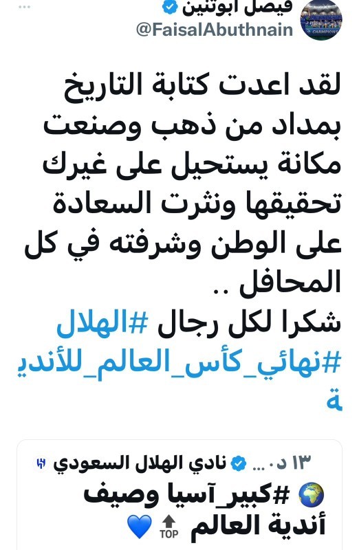 وأضاف «مشاركة مشرفة للوطن وسنعود يوماً لهذه المنصة أبطالاً بإذن الله»، في حين كتب اللاعب فيصل أبو اثنين «لقد أعدت كتابة التاريخ بمداد من ذهب وصنعت مكانة يستحيل على غيرك تحقيقها ونثرت السعادة على الوطن وشرفته في كل المحافل.. شكراً لكل رجال الهلال».