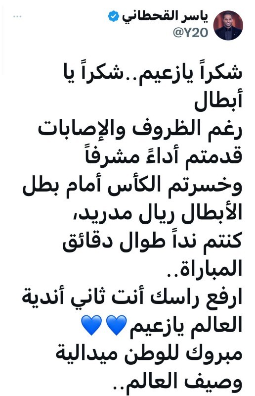 وكتب اللاعب ياسر القحطاني «شكراً يا زعيم.. شكراً يا أبطال رغم الظروف والإصابات قدمتم أداءً مشرفاً وخسرتم الكأس أمام بطل الأبطال ريال مدريد، كنتم نداً طوال دقائق المباراة.. ارفع راسك أنت ثاني أندية العالم يا زعيم، مبروك للوطن ميدالية وصيف العالم.. مبروك للعرب وللخليج هذا الإنجاز العظيم».