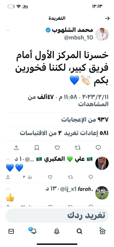 فيما كتب محمد الشلهوب «خسرنا المركز الأول أمام فريق كبير، لكننا فخورون بكم».