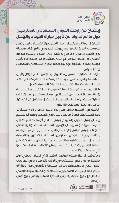 يذكر أن رابطة الدوري السعودي للمحترفين لكرة القدم علمت الإثنين الماضي بتأجيل مباراة الهلال أمام الفيحاء التي كانت مقررة يوم الأربعاء.