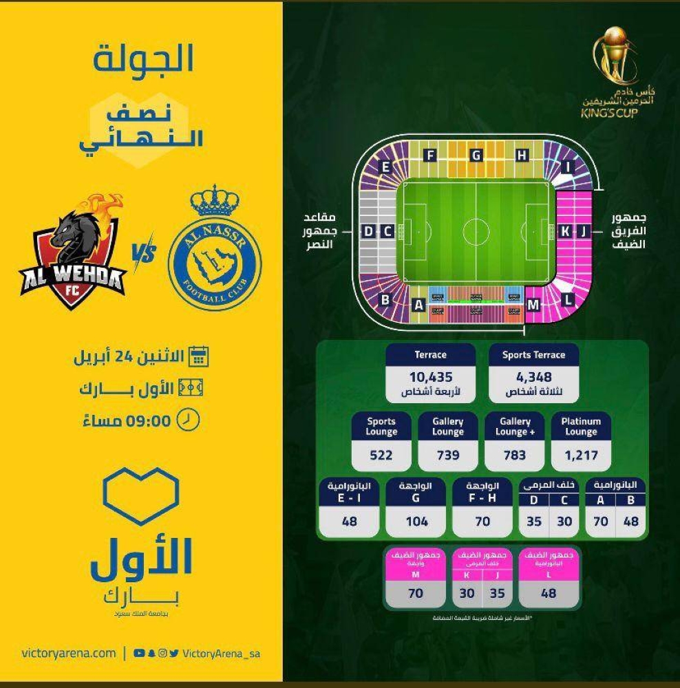 أعلن نادي النصر السعودي، عبر حساب الأول بارك الرسمي، طرح تذاكر مباراة النصر والوحدة ضمن نصف نهائي كأس الملك، التي ستقام يوم الإثنين 24 أبريل في ملعب الأول بارك بمدينة الرياض.