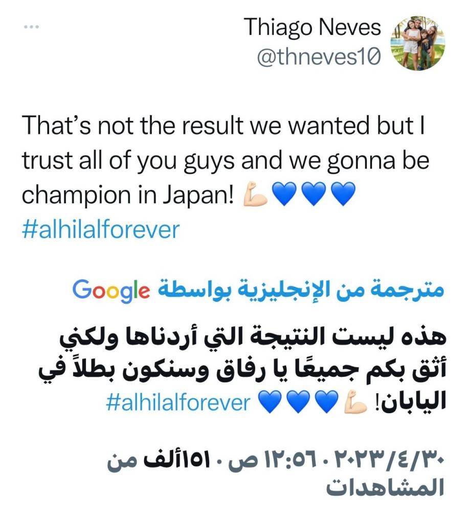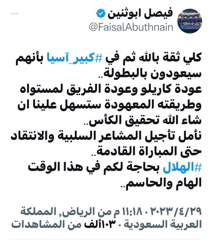بعد تعادل الفريق الهلالي أمام فريق أوراوا الياباني ضمن ذهاب نهائي كأس آسيا، علق عدد من لاعبي الهلال القدامى على هذه النتيجة غير المرضية في حساباتهم عبر «تويتر»، إذ أجمعوا على أن شوطا قد انتهى وتبقى شوط ثان في اليابان، في إشارة واضحة لدعم اللاعبين قبل مواجهة الإياب، حيث كتب المخضرم سامي الجابر: «نتيجة غير مرضية كان بالإمكان أفضل مما كان، ربع ساعة أولى مثالية فقد بعدها الفريق توازنه حرمه الذهاب إلى سايتاما بفرص أكبر للحسم، تبقى شوط ولن تكون صعبة بإذن الله على الزعيم»، وأضاف: «في مباراة الذهاب الزعيم أثبت علو كعبه رغم أنه لم يقدم المأمول، تعادل في شوط وسيتوج بإذن الله ويجدد الذكريات في سايتاما»، فيما غرد فيصل ابو اثنين: «كلي ثقة بالله ثم في كبير آسيا بأنهم سيعودون بالبطولة، عودة كاريلو وعودة الفريق لمستواه وطريقته المعهودة ستسهل علينا إن شاء الله تحقيق الكأس»، مطالبا بتأجيل المشاعر السلبية والانتقاد حتى المباراة القادمة؛ «لأن الهلال بحاجة لكم في هذا الوقت المهم والحاسم»، وأضاف الحارس العملاق محمد الدعيع: «هاردلك يا زعماء. انتهى شوط وباق شوط في اليابان وكلنا ثقة في نجومنا بتحقيق اللقب بإذن الله»، وكتب الليبي طارق التايب: «هاردلكم يا زعماء. انتهى شوط وباق شوط فى اليابان. كل شيء وارد فى كرة القدم. لازم نتفاءل ما ضاع شيء، والنهائيات تكسب وليس تلعب. وبإذن الله القادم أفضل»، وأخيرا غرد اللاعب تياغو نيفيز وقال: «هذه ليست النتيجة التي أردناها، ولكني أثق بكم جميعاً يا رفاق، وسنكون أبطالاً في اليابان».