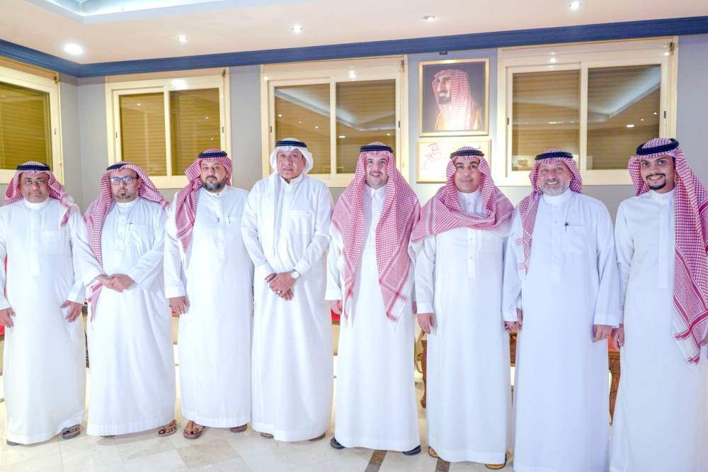 الأمير عبدالله بن سعد وعبدالله خوقير، وحاتم خيمي، والدكتور بسام غلمان، وتركي مدخلي، وأحمد شعيب، خلال اجتماع للقائمة المرشحة لرئاسة نادي الوحدة.