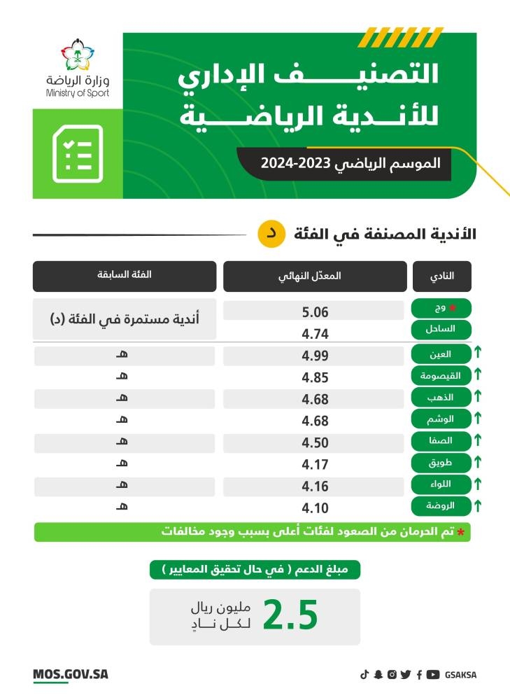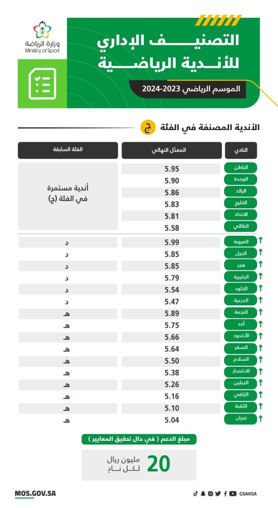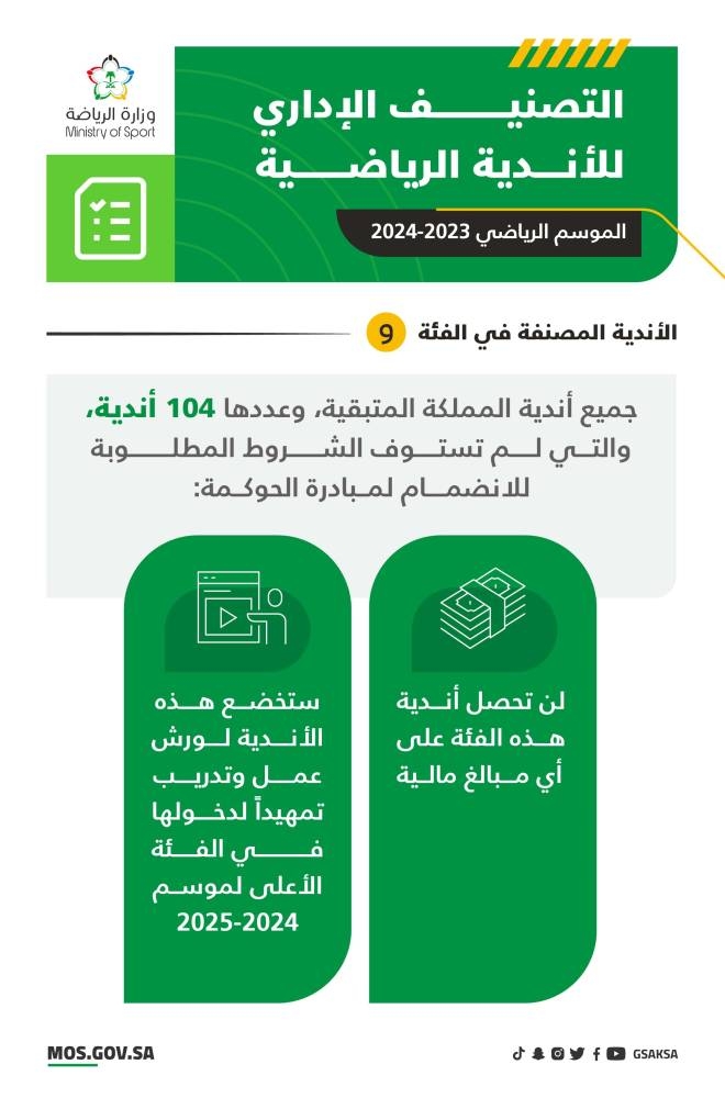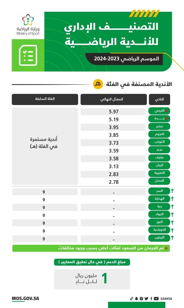 أعلنت وزارة الرياضة اليوم (السبت) 15 يوليو 2023 التصنيف الإداري للأندية الرياضية للموسم الرياضي 2023-2024، الذي يعتمد على نتائج تقييم الأندية في مبادرة الحوكمة للموسم الرياضي الماضي 2022-2023، من الربع الأول وحتى الربع الرابع.