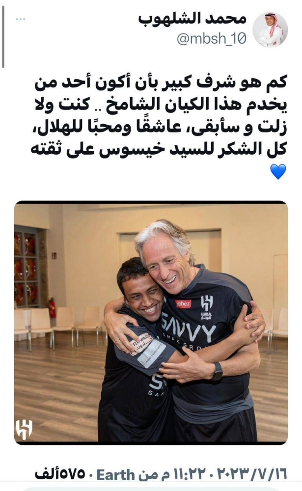 أعرب قائد الهلال سابقاً محمد الشلهوب، عن شكره وتقديره للمدرب البرتغالي خورخي خيسوس، الذي اختاره مساعداً له في الجهاز الفني قبل عدة أيام. هذا وكتب الشلهوب عبر حسابه في وسائل التواصل الاجتماعي «تويتر» قائلاً: «كم هو شرف كبير بأن أكون أحد من يخدم هذا الكيان الشامخ»، وأضاف: «كنت ولا زلت وسأبقى عاشقاً ومحباً للهلال»، واختتم تغريدته بقوله: «كل الشكر للسيد خيسوس على ثقته».