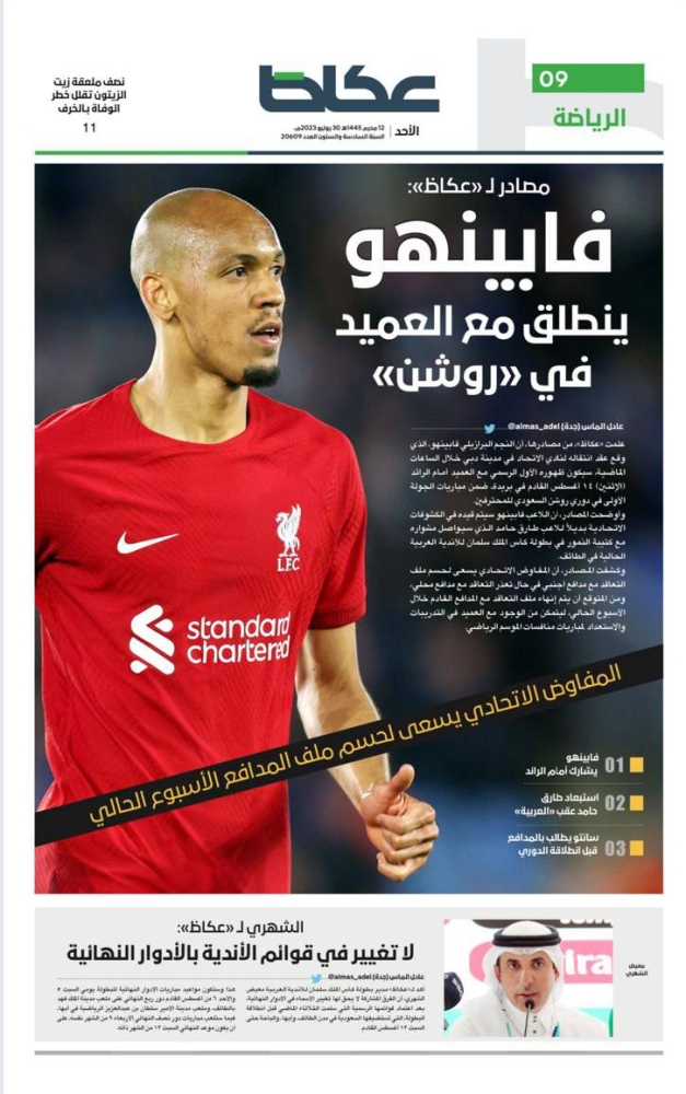 صادق مدرب الاتحاد سانتو، في المؤتمر الصحفي الذي عقد قبل مواجهة الشرطة العراقي، على تميز «عكاظ» بعدم مشاركة النجم البرازيلي فابينهو، الذي وقع عقداً احترافياً مع العميد لمدة ثلاثة مواسم، في بطولة كأس الملك سلمان للأندية العربية لعدم قيده في قائمة الفريق، على أن تكون انطلاقته مع الفريق الاتحادي في مباراة الرائد الإثنين 14 أغسطس الجاري في الجولة الأولى من دوري روشن السعودي للمحترفين، كما أشارت «عكاظ» في عددها الأحد الماضي.