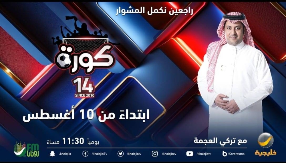 ويعود الإعلامي الرياضي تركي العجمة ليلتقي جمهوره من عشاق الساحرة المستديرة في المملكة والخليج، ويقدم موسماً جديداً ومختلفاً من البرنامج، فيما يشاركه في تقديم الحلقات المذيع عبدالله العضيبي.