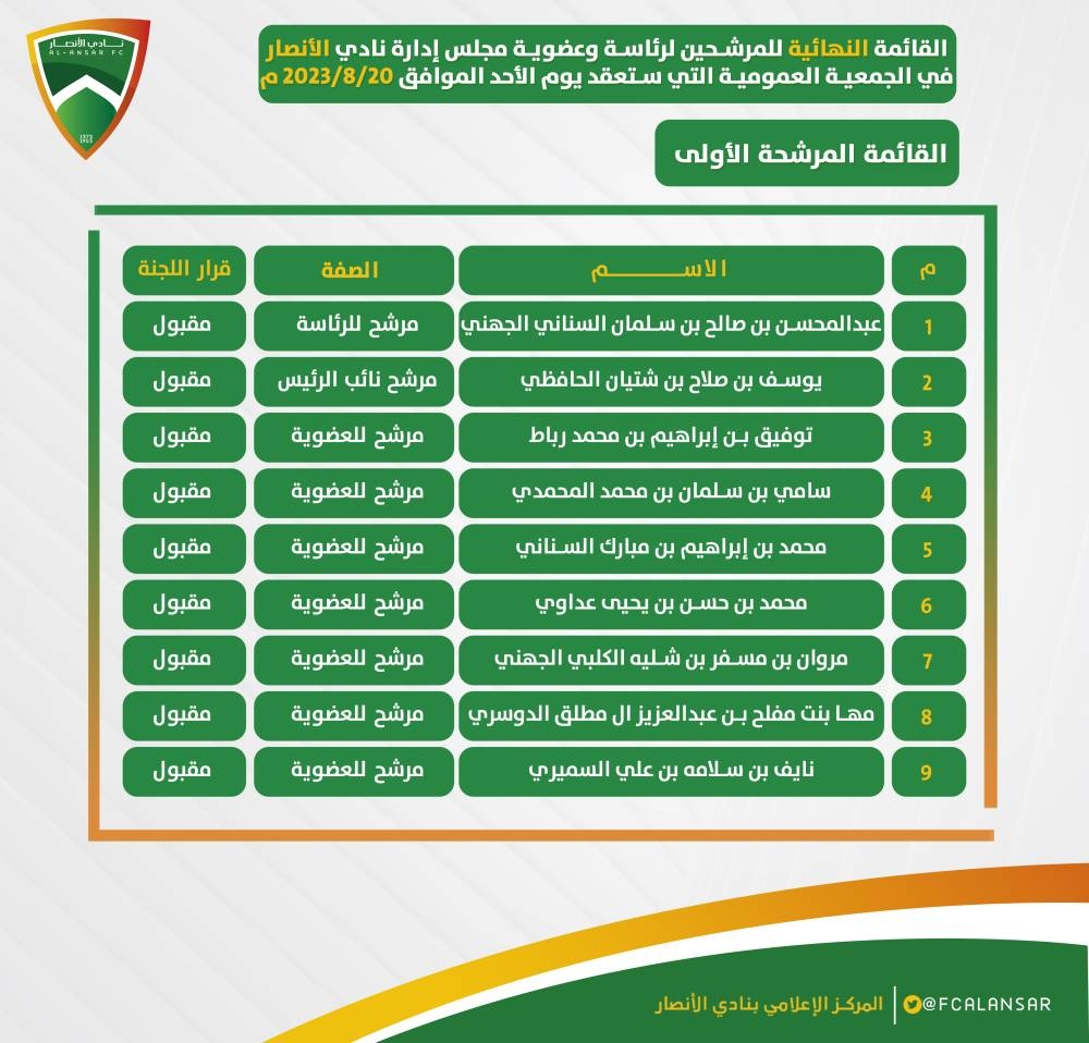 أعلن نادي الأنصار عبر حسابه الرسمي على موقع التواصل الاجتماعي «x» فوز عبدالمحسن الجهني برئاسة مجلس إدارة النادي لمدة أربع سنوات. وحصلت قائمة المرشح عبدالمحسن الجهني على ١١٩٩ صوتاً، مقابل ثلاثة أصوات لقائمة المرشح حاتم بن جعفر بالي، في الجمعية العمومية الـ٥٣ التي عُقدت بمقر النادي.