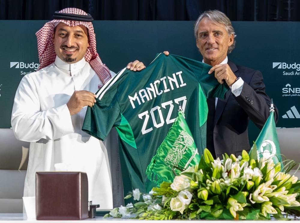 رئيس الاتحاد السعودي ياسر المسحل ومدرب المنتخب السعودي مانشيني.