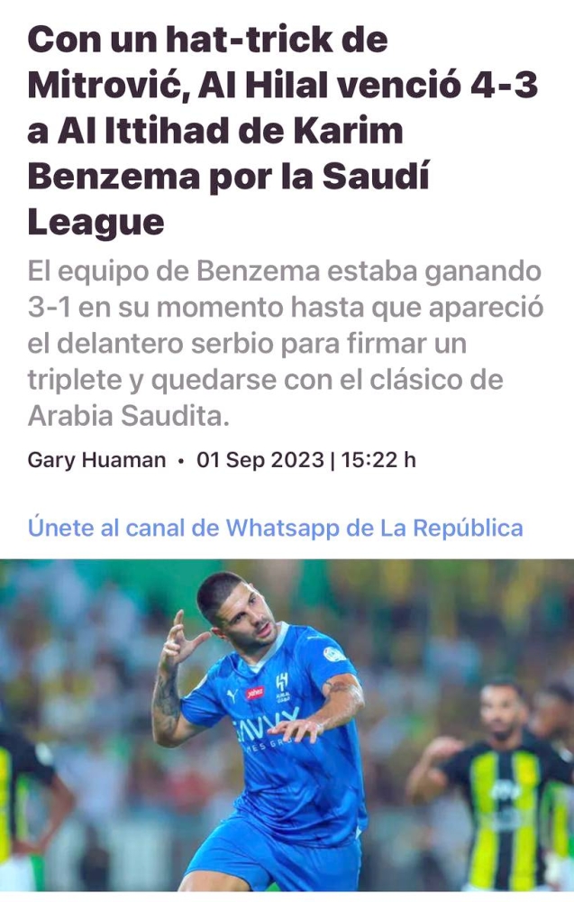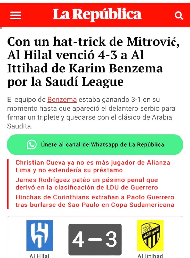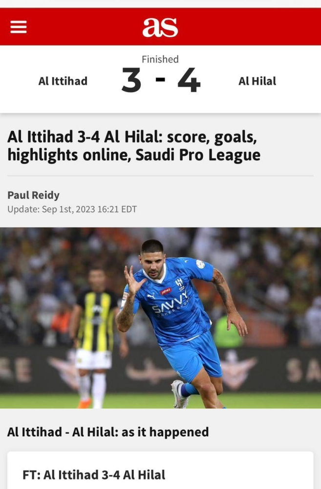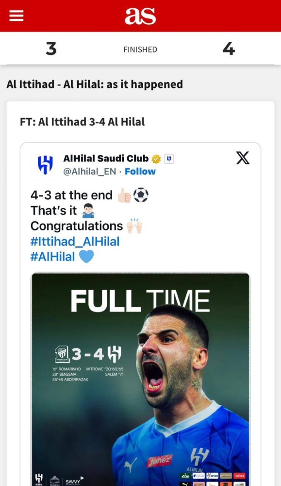 وكتبت صحيفة «آس الإسبانية»: «دراما ضخمة في جدة، إذ استطاع الهلال أن يعود من تأخره 3-1 أمام الاتحاد، ليقلب الموازين ويحقق فوزاً تاريخياً 4-3 بثلاثية من ميتروفيتش الذي كان بطل الليلة؛ ليحتفل فريق خيسوس بصدارة الدوري السعودي للمحترفين»، واختتمت صحيفة «larepublica» البيروفية: «بثلاثية ميتروفيتش، الهلال استطاع الفوز على الاتحاد بحضور الخطير كريم بنزيما».