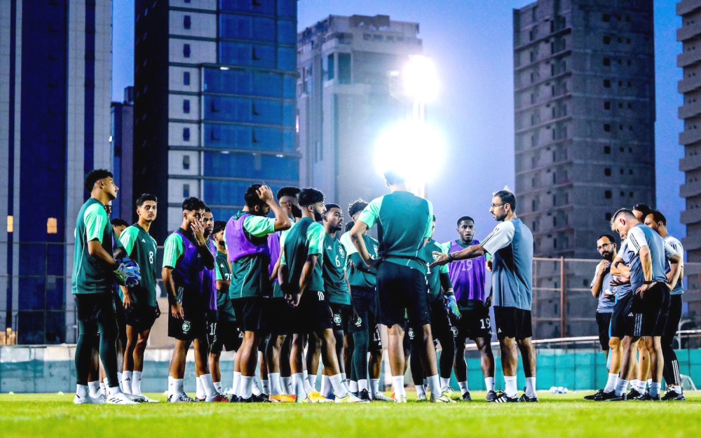 مدرب المنتخب السعودي الأولمبي الكابتن سعد الشهري في اجتماع مع اللاعبين.