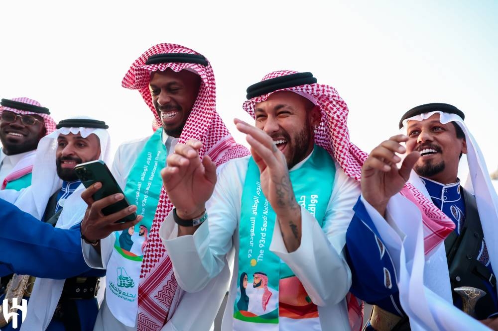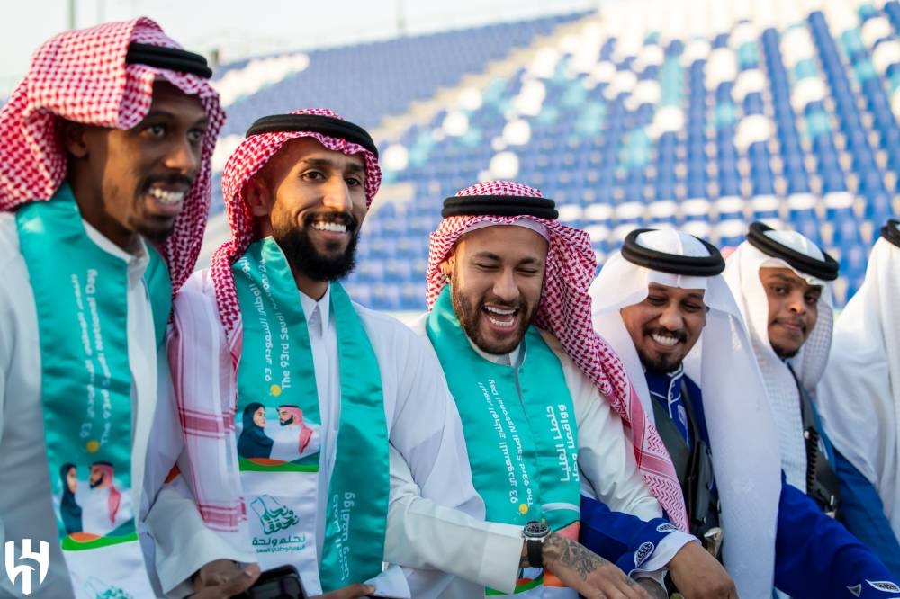 في مشهد لافت يؤكد تأثير القوة السعودية الناعمة في المجال الرياضي، دخل نجوم العالم المحترفون في الدوري السعودي على خط الاحتفالات باليوم الوطني الـ93 للمملكة، وظهر كريستيانو رونالدو ونيمار وبنزيما ورياض محرز وجيرارد وغيرهم من النجوم وهم يرتدون الثوب ويؤدون العرضة السعودية، في تفاعل يجسد انسجامهم مع المجتمع والأحداث المحلية، ما يؤكد فاعلية المشروع الرياضي السعودي الذي تقف وراءه نظرة ثاقبة ورؤية حكيمة.