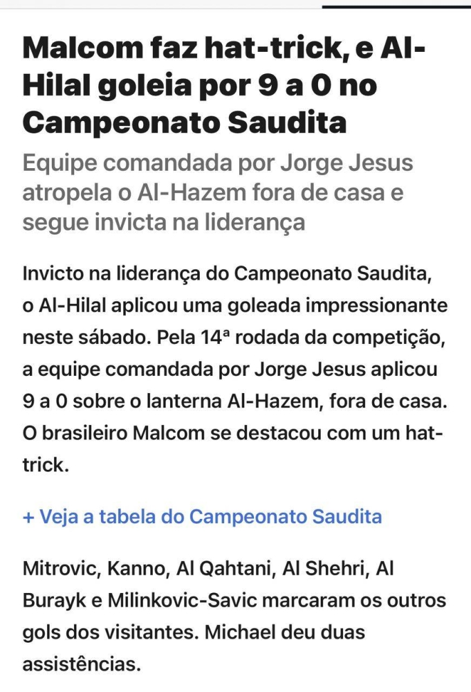 في حين كتبت صحيفة «غلوبوالبرازيلية»: «اللاعب مالكوم سجل هاتريك للمرة الثانية في الدوري، والهلال يواصل تألقه ويفوز على الحزم بنتيجة مدوية قوامها 9-0 في الدوري»، وأضافت: «المدرب البرتغالي جيسوس يواصل عمله المميز مع الهلال ويتفوق على الحزم ويحافظ على سجله خالياً من أي خسارة مع الهلال».