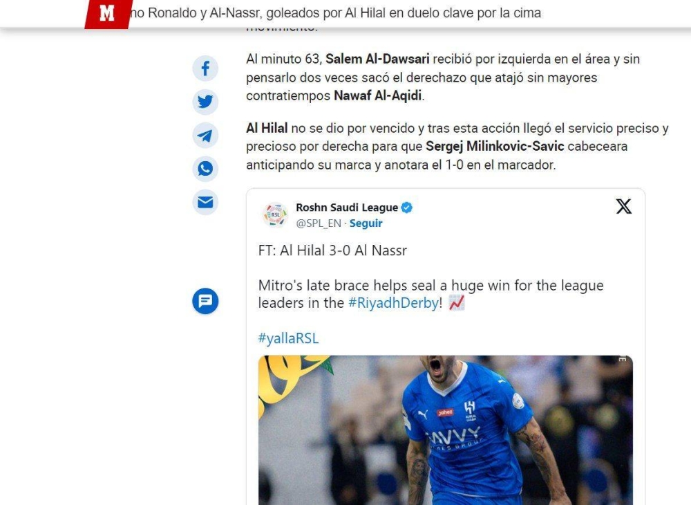 وكتبت صحيفة «ماركا» الإسبانية: «رونالدو وفريقه يتلقيان الخسارة من الهلال في مباراة حاسمة على التمسك بالقمة، وهذه الليلة لن تُنسى للنجم البرتغالي بعد الخسارة بنتيجة 3-0 أمام المنافس التقليدي». وأضافت: «النجم الصربي المحترف في الفريق الهلالي ميتروفيتش كانت ليلته جميلة بعد أن سجل هدفين في وقت مهم من المباراة، الهلال حالياً الأكثر تماسكاً وتميزاً بوصوله إلى النقطة 41 نقطة».