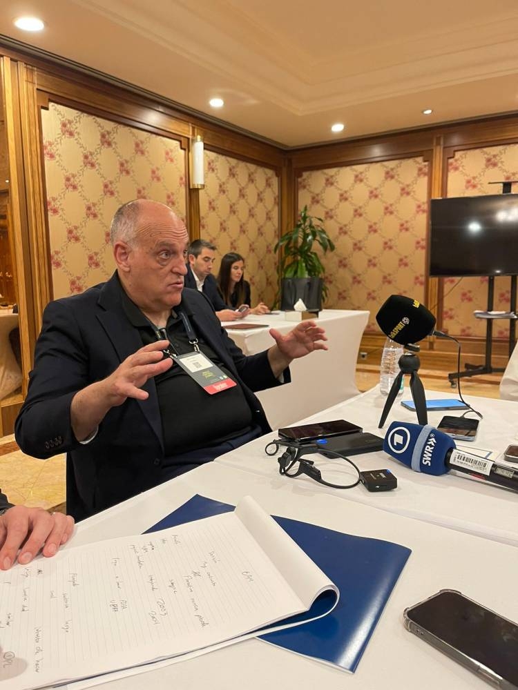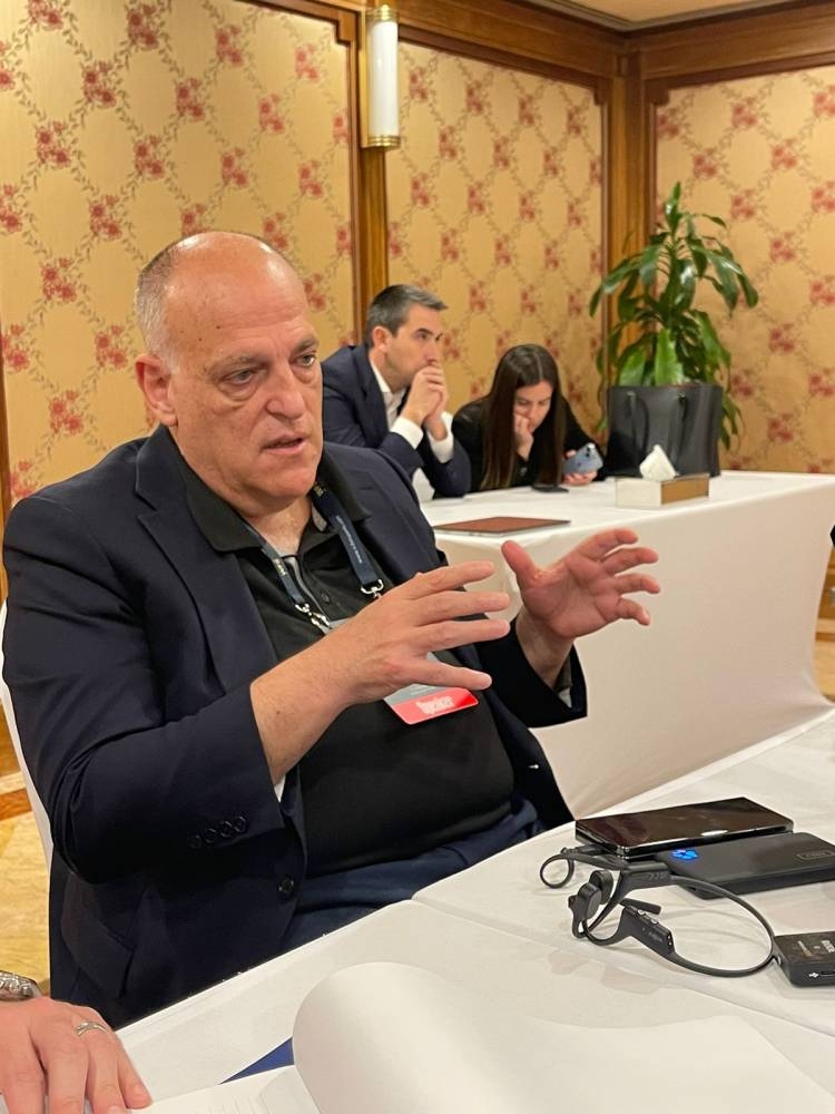 في جلسة خاصة على هامش تواجده كمتحدث في مؤتمر القمة العالمية لكرة القدم في مدينة جدة، تحدث السيد خافيير تيباس رئيس رابطة الدوري الاسباني (لا ليغا) لـ«عكاظ» حول مجموعة من النقاط التي يسأل عنها الشارع السعودي والعالمي. السيد خافيير للتو تم تزكيته كرئيس لرابطة لليغا حتى 2027.
