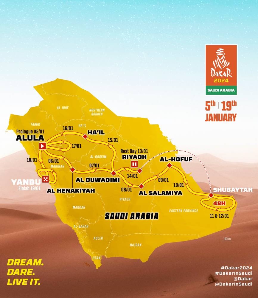هذا العام، تعود منافسات النسخة 46 من رالي داكار مجدداً إلى السعودية بمسار جديد كلياً خلال الفترة من 5 – 19 يناير 2024، حيث يمتد السباق على مدار 13 مرحلة، ولمسافة أكثر من 7900 كيلومتر في مختلف أنحاء السعودية، وسيمر المسار هذا العام بالعلا، والحناكية والدوادمي والسلامية والهفوف وشبيطة والرياض وحائل ويختتم في ينبع، وتشارك في السباق 434 مركبة في مختلف فئات السباق، بمشاركة 778 سائقاً وملاحاً يمثلون أكثر من 72 دولة مختلفة.