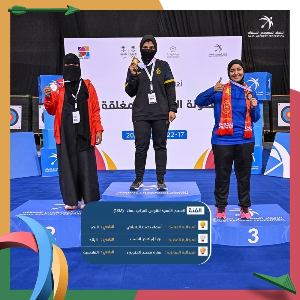 وحصل على المركز الأول من فئة السهم الأسود للقوس المركب بمسافة 18 متراً (نساء) أكبر من 18 عاماً أسماء الزهراني من نادي النصر، و(رجال) أكبر من 18 عاماً سالم العلياني من نادي الزيتون، وأقل من 21 عاماً حمدي الراشدي من نادي البدائع.