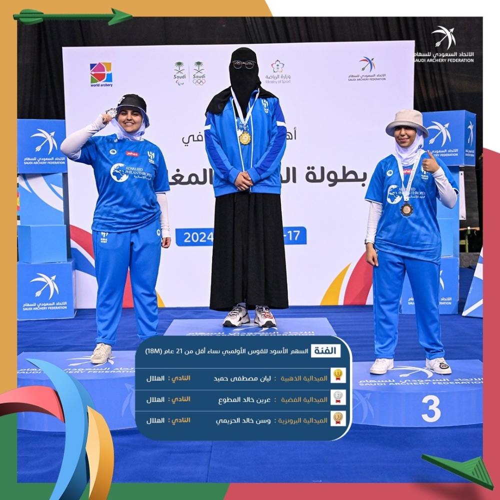 وحقق الميدالية الذهبية بمسافة 18 متراً من فئات السهم الأسود للقوس الأولمبي (نساء) أكبر من 18 عاماً روعة متبولي من نادي الاتحاد، وأقل من 18 عاماً تسنيم الشهري من نادي الثقبة، وأقل من 21 عاماً ليان حميد من نادي الهلال، ومن فئات السهم الأسود للقوس الأولمبي (رجال) أكبر من 18 عاماً سعد العويرضي من نادي القادسية، وأقل من 18 عاماً فهد الغامدي من نادي الاتفاق، وأقل من 21 عاماً مالك الرشيدي من نادي الرائد.