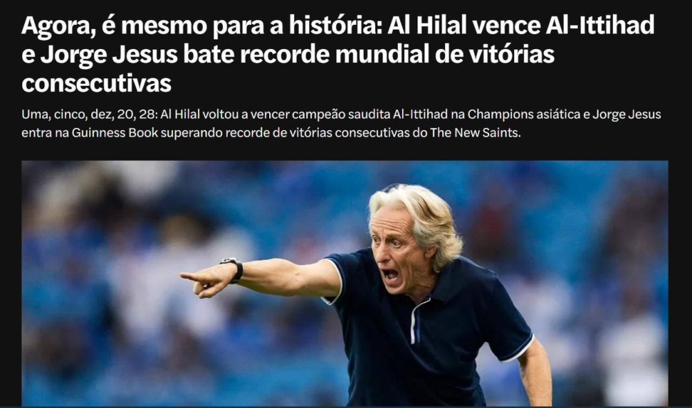 فيما كتب موقع «observador» البرتغالي: «حان وقت كتابة التاريخ والمدرب البرتغالي جيسوس يواصل التميز ويحطم الرقم القياسي العالمي للانتصارات المتتالية، استطاع أن يدخل موسوعة غينيس من أوسع أبوابها بـ28 فوزاً متتالياً».